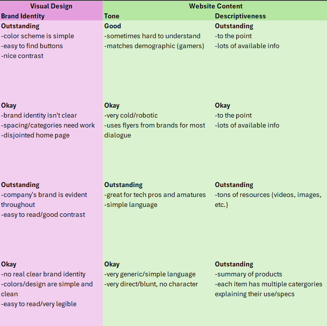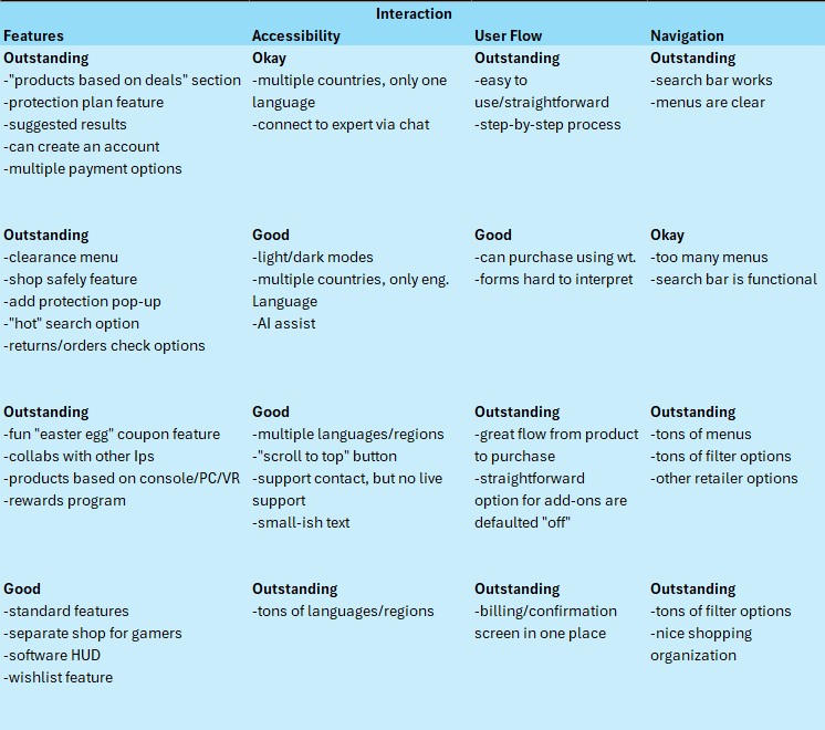 I’ve done website audits to determine the type of ecommerce sites out there for gaming equipment. I also conducted interviews with gamers between the ages of 25 - 35 to gain insight into the type of website they would like to have for purchasing equipment. I found that many users were upset with the lack of clarity when trying to find that they need. They were also struggling with the “checkout” process when attempting to purchase products. This matched the audit I performed where I found many of the sites to lack visual clarity and a user flow to purchase products from their sites.