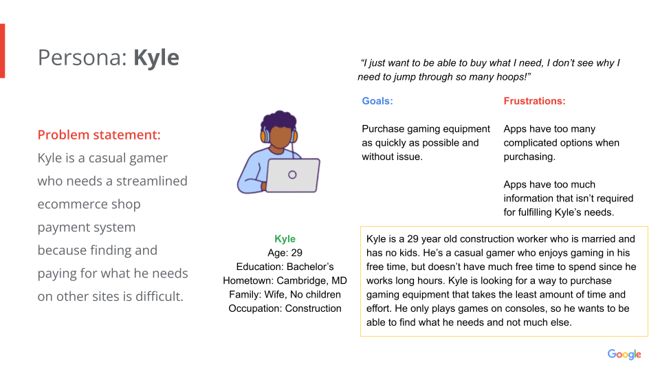 I created a user journey map to assist “Kyle” in making the purchasing process for PC equipment easy and clear.